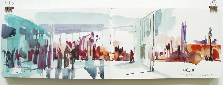 Il fait froid et humide, c'est peu propice aux aquarelles en extérieur! Les transports en commun permettent de continuer à s'entraîner la main jusqu'au retour des beaux jours.